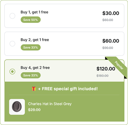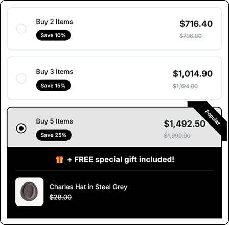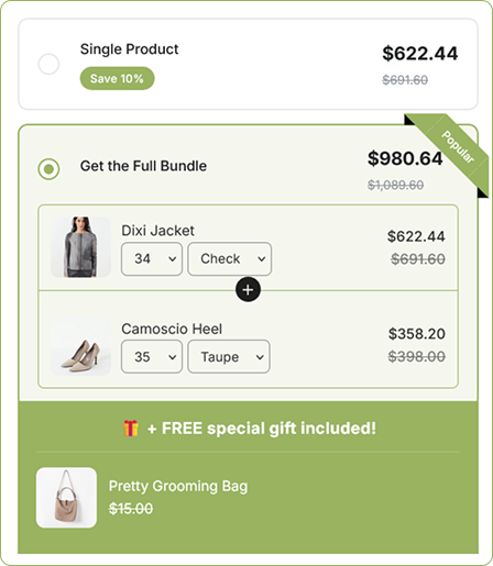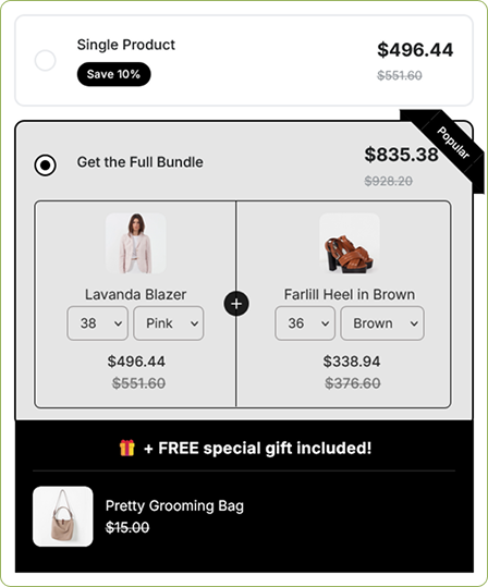 Build custom bundles that encourage customers to buy more. Increase average order value with smart product combinations. Deliver a better shopping experience without writing code.